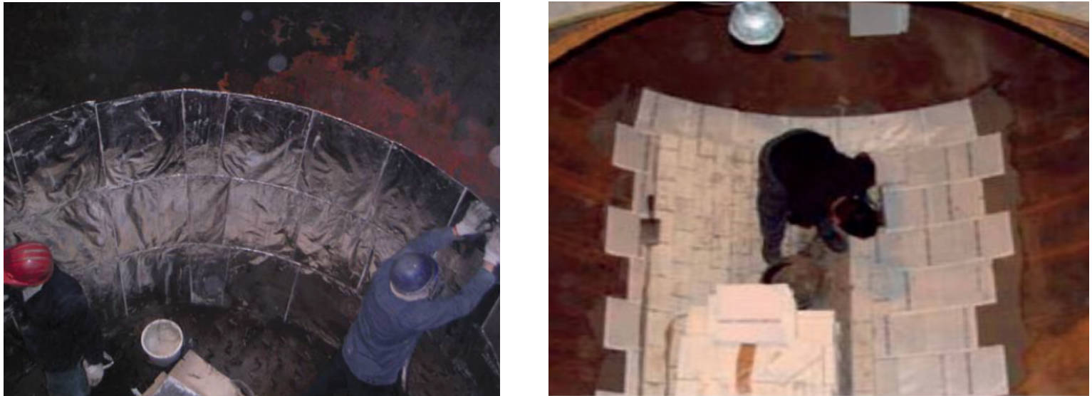 First, clean the inner walls of the ladle thoroughly. Apply a layer of adhesive to the ladle wall, then install the MIP-950S insulation layer. Afterward, construct the permanent and working layers in sequence.